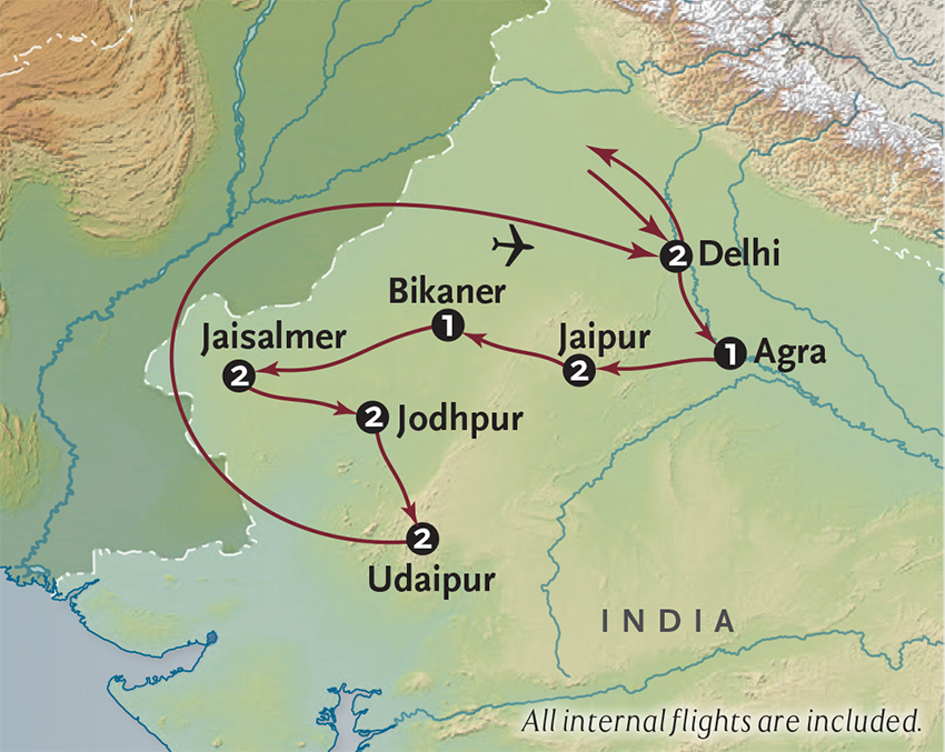 Later this afternoon, you’ll tour the magnificent Mehrangarh Fort, which stands atop a 400-foot hill overlooking the city. Behind these massive walls which soar up to 120 feet is an extraordinary complex of ornate places decorated with carved panels, delicate lattice windows and beautiful stained glass. First established in 1459, many of the fort’s current structures were built in the 17th century and today Mehrangarh is one of the largest forts in all of India. It is also home to a fabulous collection of memorabilia from Jodhpur’s royal families – ornate palanquins, elephant howdahs, miniature paintings, priceless antiques and glittering costumes. End your touring with a guided stroll through the city’s bustling market – which comes to life as the sun sets and the desert air begins to cool. Meals B+L